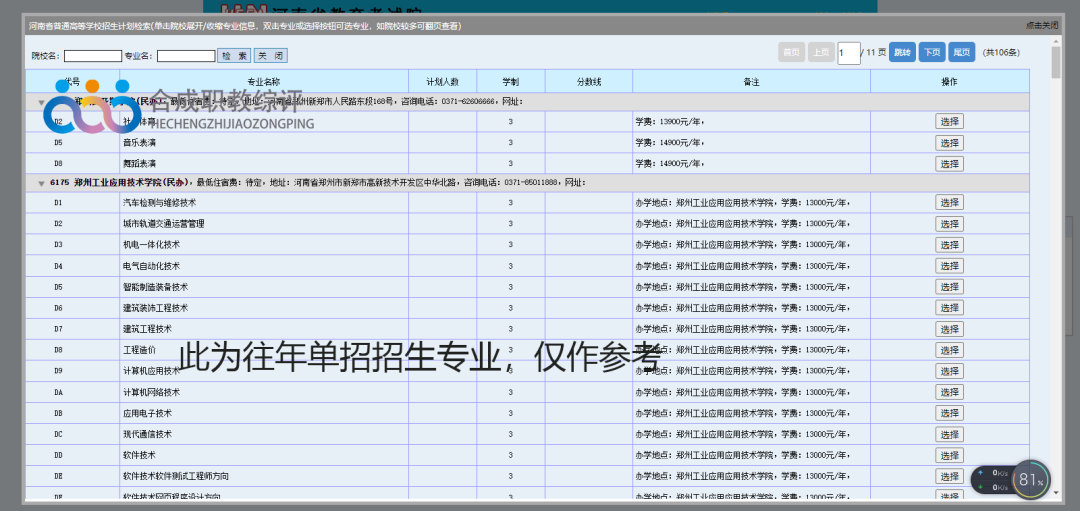 院校、专业选择页面如下,点击所选志愿,系统会自动进行填写。