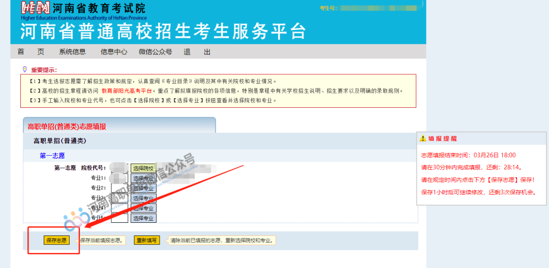 点击跳转进入河南省教育考试院官网,点击如下图示位置,进入“河南省普通高校招生考生服务平台”系统。